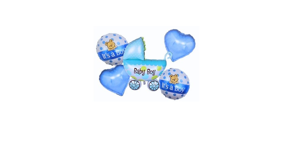 Zestaw 5 szt balonów Baby Boy. Wózek - 30 cali Balon okrągły 2szt - 18 cali Balon gwiazda 2szt - 18 cali