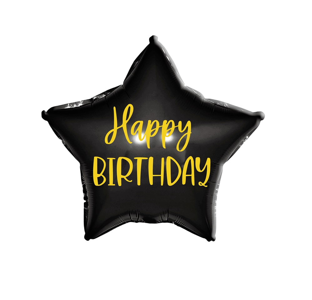 Balon foliowy Gwiazda Rozmiary 18 cali- 45 cm Na powietrze i na hel. Czarny ze złoty napisem Happy Birthday Opakowanie 50szt