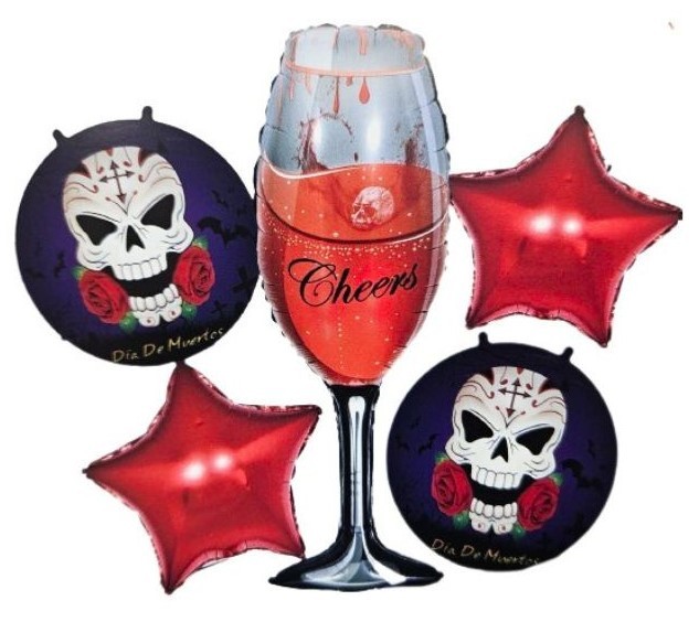 Zestaw 5 szt balonów Halloween. Kieliszek Cheers - 39 cali Balon okrągły 2szt - 18 cali Balon czerwona gwiazda 2szt - 18 cali