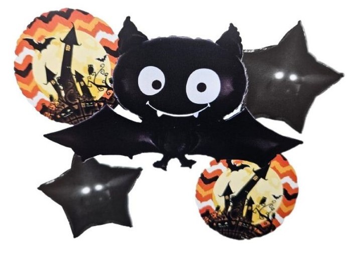 Zestaw 5 szt balonów Halloween. Nietoperz - 29 cali Balon okrągły 2szt - 18 cali Balon czarna gwiazda 2szt - 18 cali