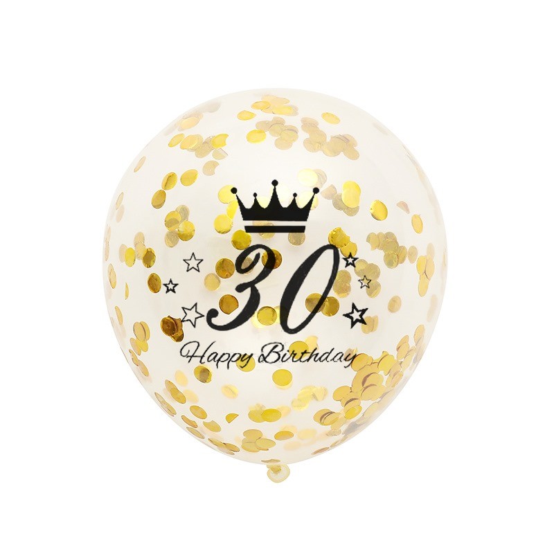 Transparentne balony z dwustronnym czarnym napisem Happy 30th birthday i okrągłym złotym konfetti w środku, średnica balonu ok. 30 cm. 100szt
