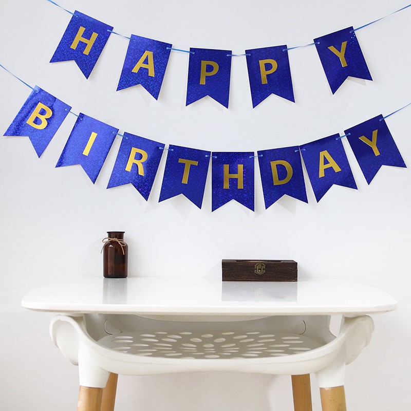 Baner granatowy Happy Birthday, ze złotym napisem W zestawie taśma. Długość baneru ok 180 cm, długość taśmy ok 250 cm| Opakowanie 12 szt