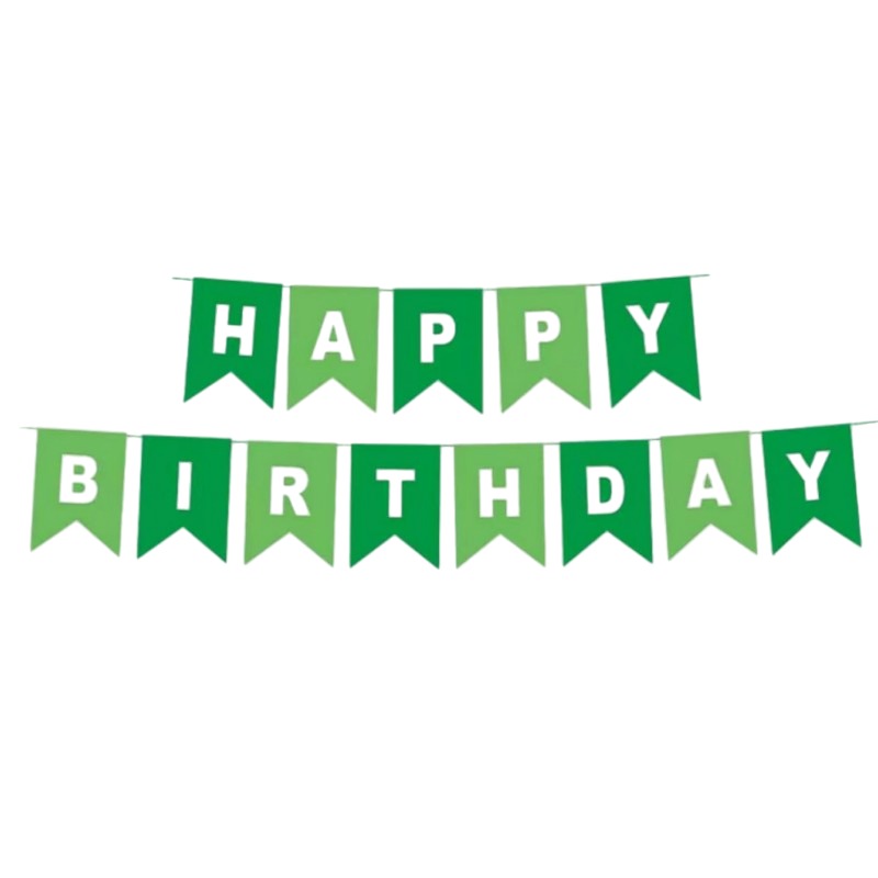 Baner , zielony ze białymi literami, Happy Birthday W zestawie taśma. Długość baneru ok 180 cm, długość taśmy ok 250 cm| Opakowanie 12 szt