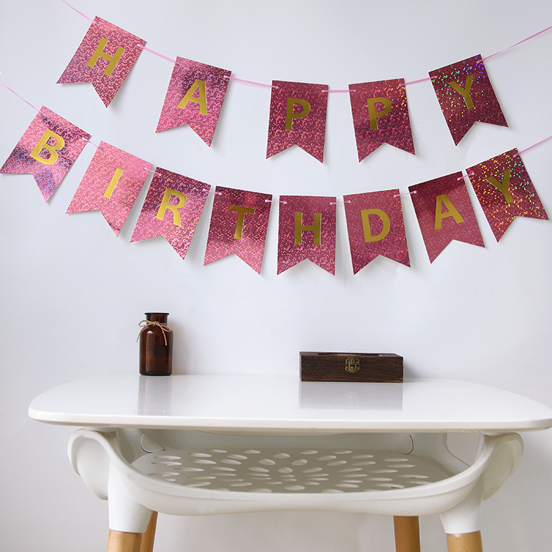 Baner różowy Happy Birthday, ze złotym napisem W zestawie taśma. Długość baneru ok 180 cm, długość taśmy ok 250 cm| Opakowanie 12 szt