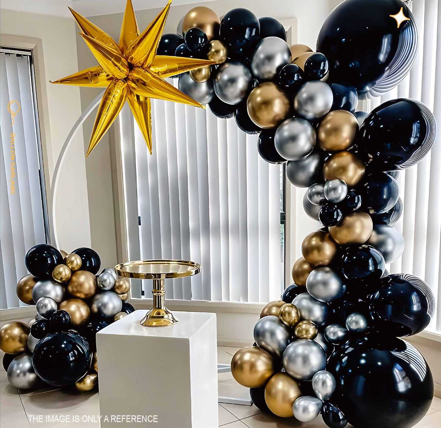 Girlanda balonowa 96szt Zestaw zapakowany w kartonowe pudełko. Kolor balonów czarno złoto srebrny