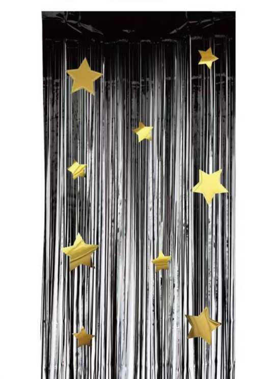 Kurtyna imprezowa paski. Kolor czarny + złote gwiazdki. Wymiary gwiazdek: -12cm - 5szt -17cm - 4szt Wymiary 100x200cm Opakowanie 10 szt