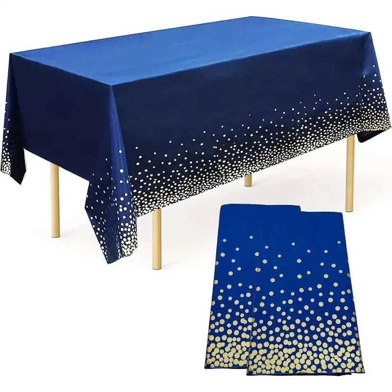 Obrus foliowy granatowy w złote kropki konfetti 137×274 cm