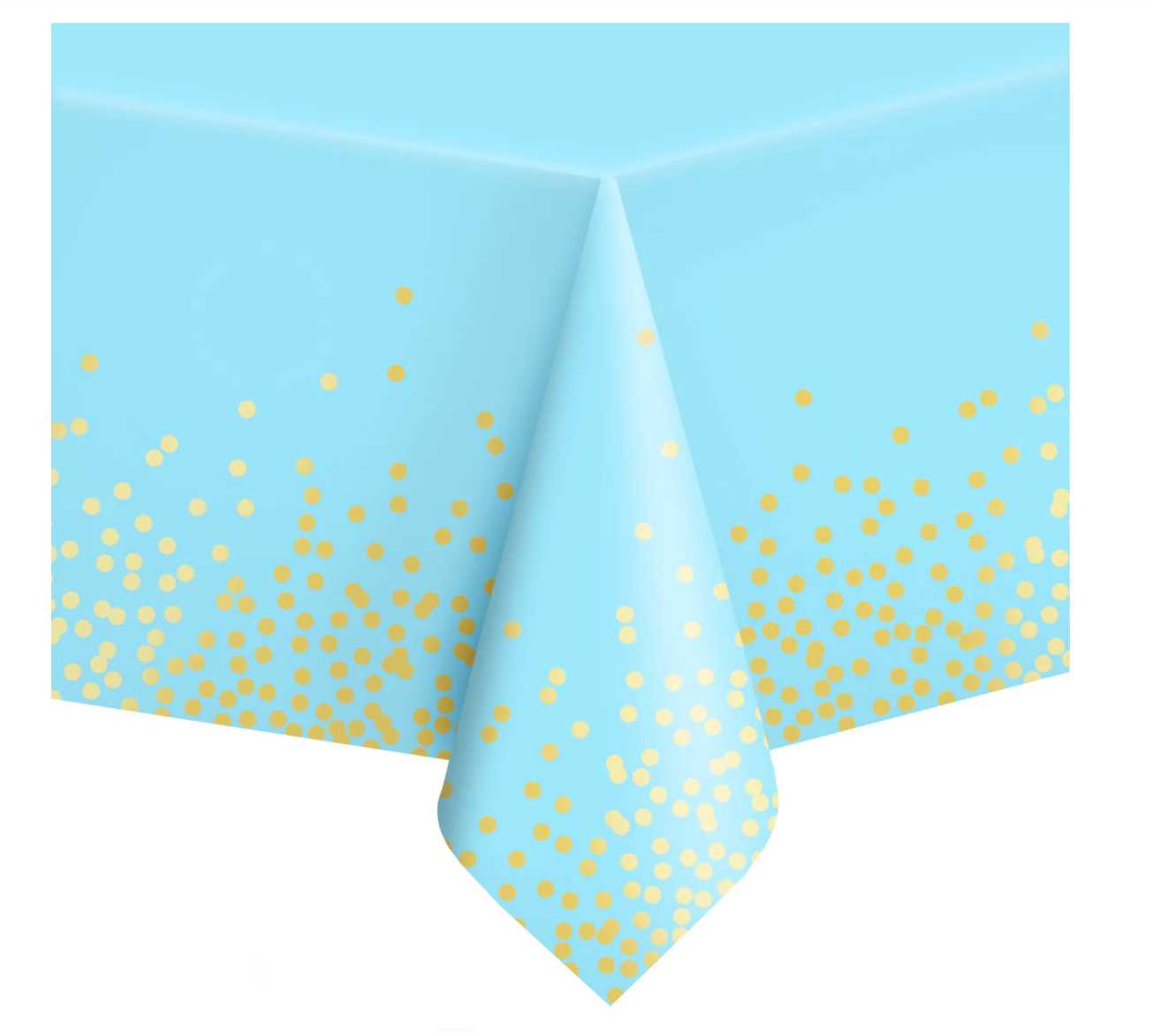 Obrus foliowy. Niebieski w złote kropki Rozmiar 137 cm x 274 cm Minimum zakupu 10 szt