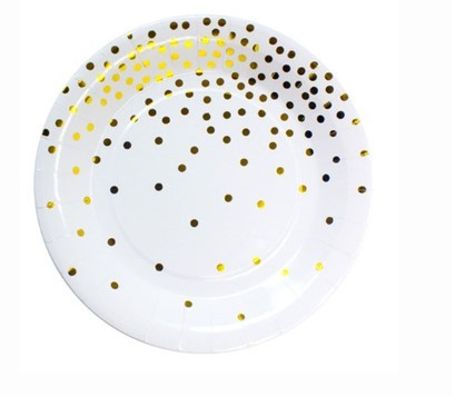 Talerzyki papierowe. Kolor biały w złote kropki, 7cali. 1 opakowanie – 6szt Minimum zakupu 12 opakowań