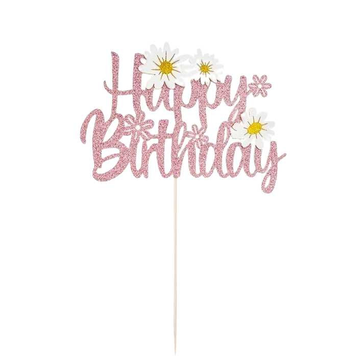 Topper na ciasto, tort Happy Birthday stokrotki, błyszczący