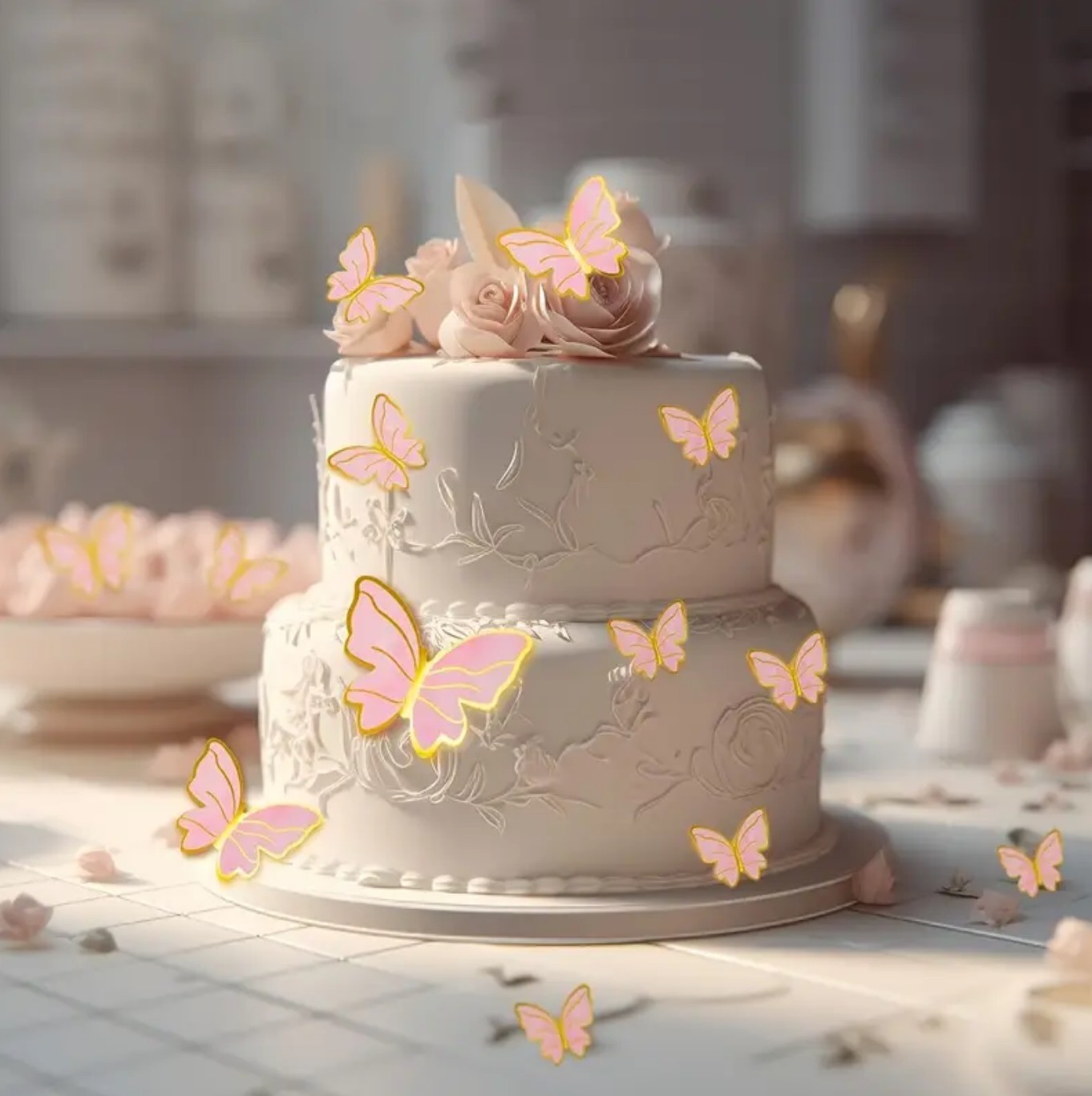 Topper na tort. Wzór motyle. Długość około 15cm. Motyle różnej wielkości. Jedno opakowanie 10szt, opakowanie zbiorcze 12.